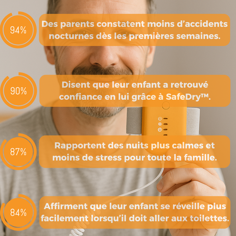 Votre enfant a du mal à rester au sec la nuit ? Les réveils, les lessives et la perte de confiance deviennent difficiles pour toute la famille.SafeDry™ intervient dès les premières gouttes grâce à son capteur ultra-précis et réveille votre enfant en douceur.Nuit après nuit, il apprend naturellement à reconnaître les signaux de sa vessie pour retrouver des nuits sèches — sans médicaments, et en toute autonomie.